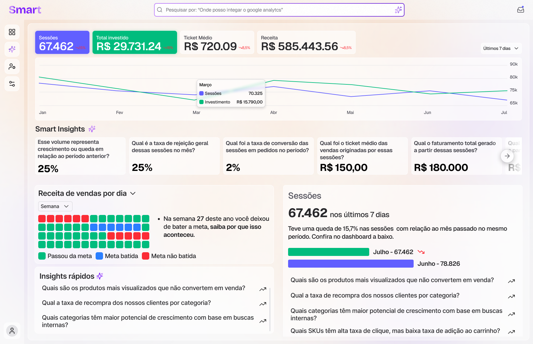 Navegue entre suas principais métricas de negócio e receba insights dinâmicos para tracionar ainda mais seus resultados